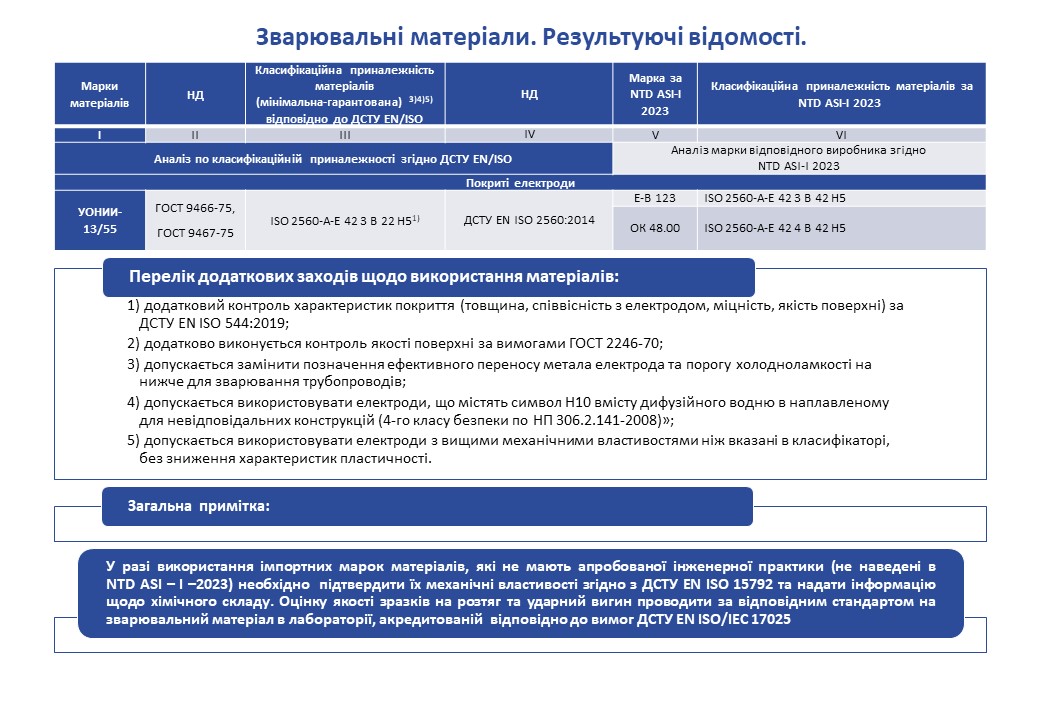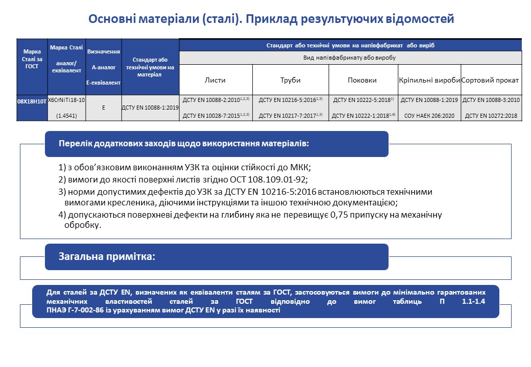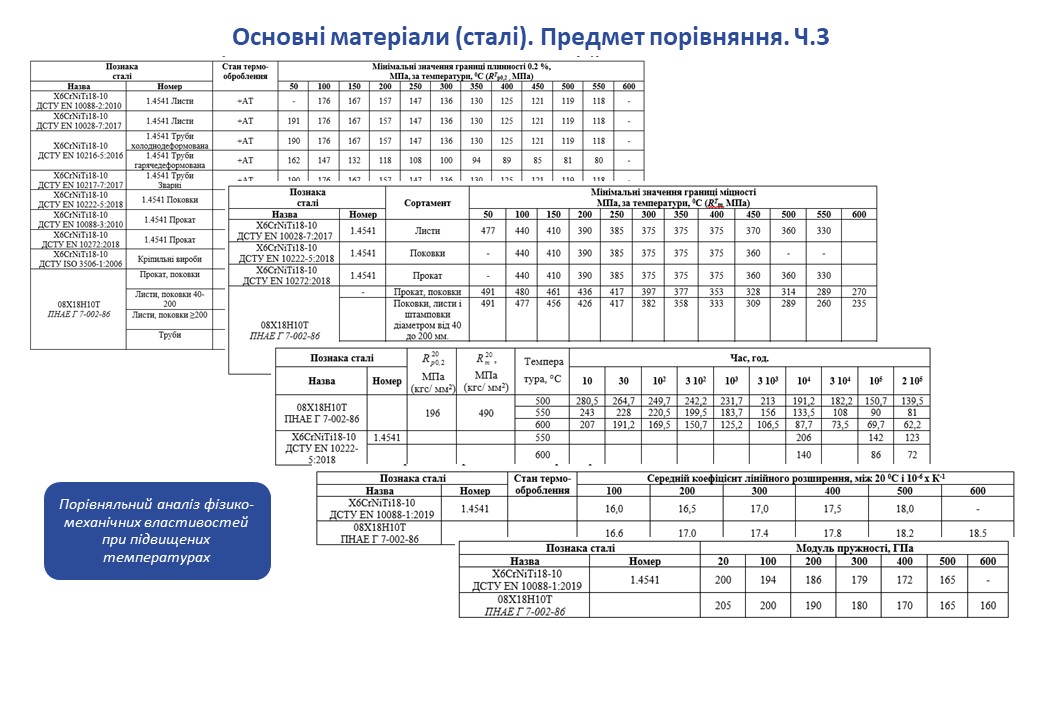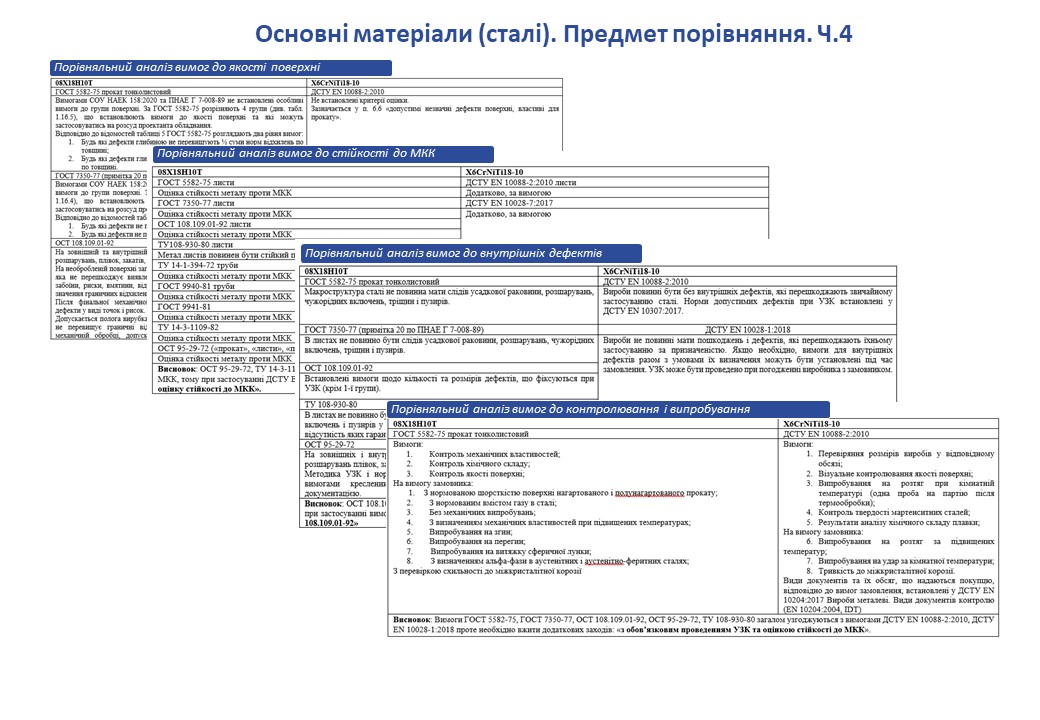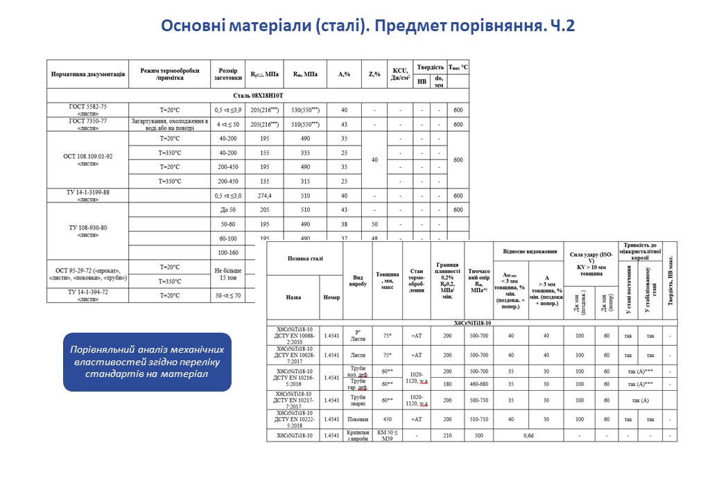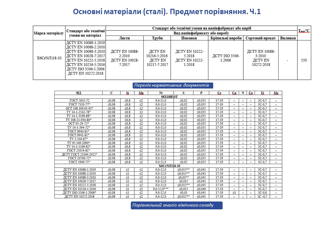 Analytical method. This is a comparison of the characteristics and requirements for russian material specified in GOST/OST/TU with similar characteristics in the DSTU, EN, ISO standards for imported materials.